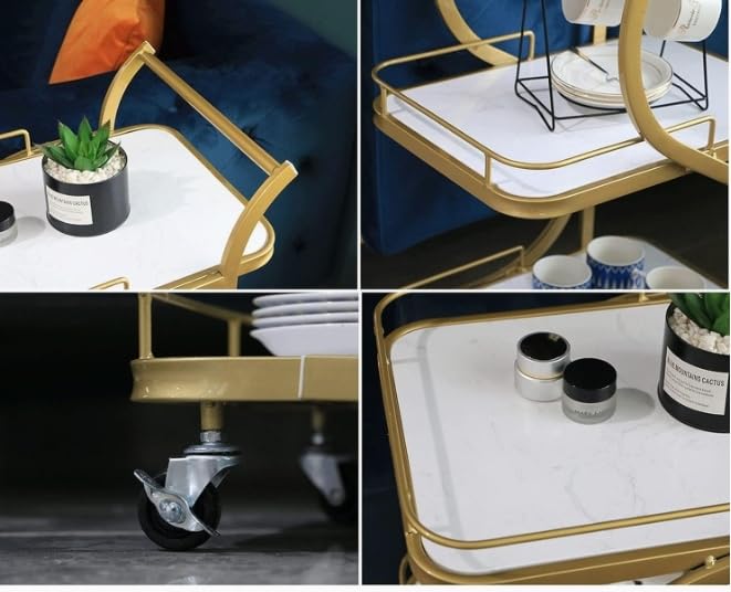 Each tier provides enough room to organize plates, cutlery, glasses, bottles, and serving accessories neatly. The raised edges help keep items secure, while the strong metal structure ensures stability and long-lasting durability. Smooth-rolling caster wheels allow easy movement from one room to another, making serving effortless and convenient.