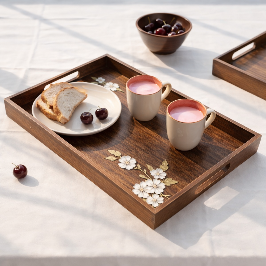 Designed with gently raised edges, the tray offers both practicality and elegance, helping to keep items secure while maintaining a clean, refined silhouette. Sturdy yet lightweight, it is easy to carry from room to room, making it ideal for serving tea, coffee, or meals, as well as presenting snacks, desserts, or appetizers for guests. Integrated handles or subtly carved grips provide comfortable handling without compromising the tray’s minimalist aesthetic